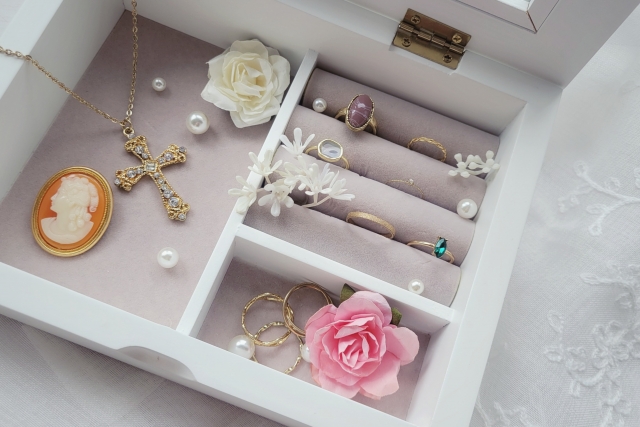 タンスの中の思い出の品、アクセサリー、写真、趣味のコレクション。